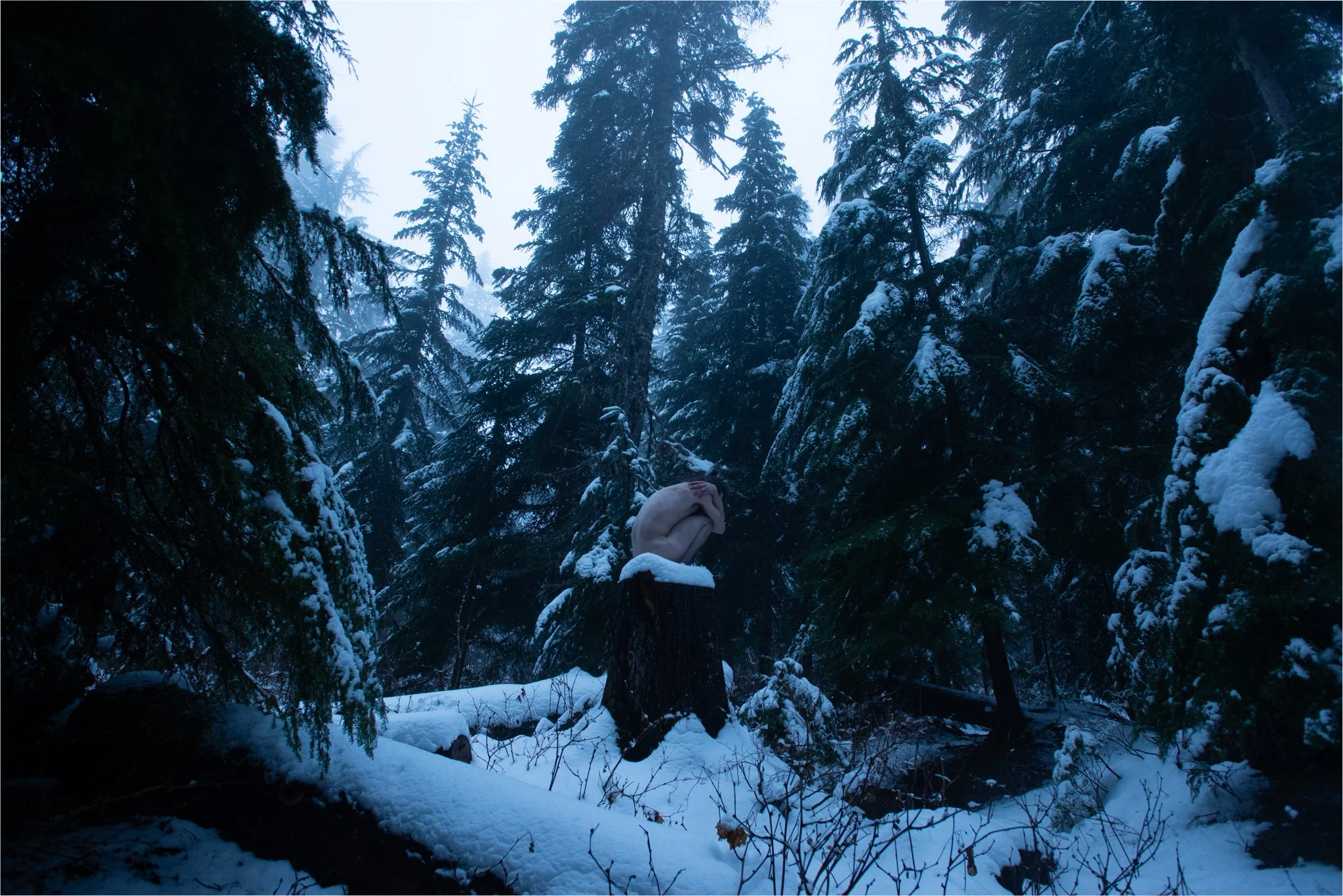 On a cold yet pleasant December afternoon, I found myself standing outside the quaint cabin I’d been watching for the previous few weeks. As I supervised the owner’s adorable 17 year old dog go to the restroom, I look out and see this tree stump, positioned in a way that is simply begging for a spotlight- wanting nothing but attention, and so I surrender mine with little resistance. This tree, though currently dying and missing the majority of its emerged self, still stood beautifully in this section of forest. This was a perfect pedestal for myself. A perfect pedestal to display nude skin in a cold environment, highlighting both this beautiful passing life, and a small amount of humanity.