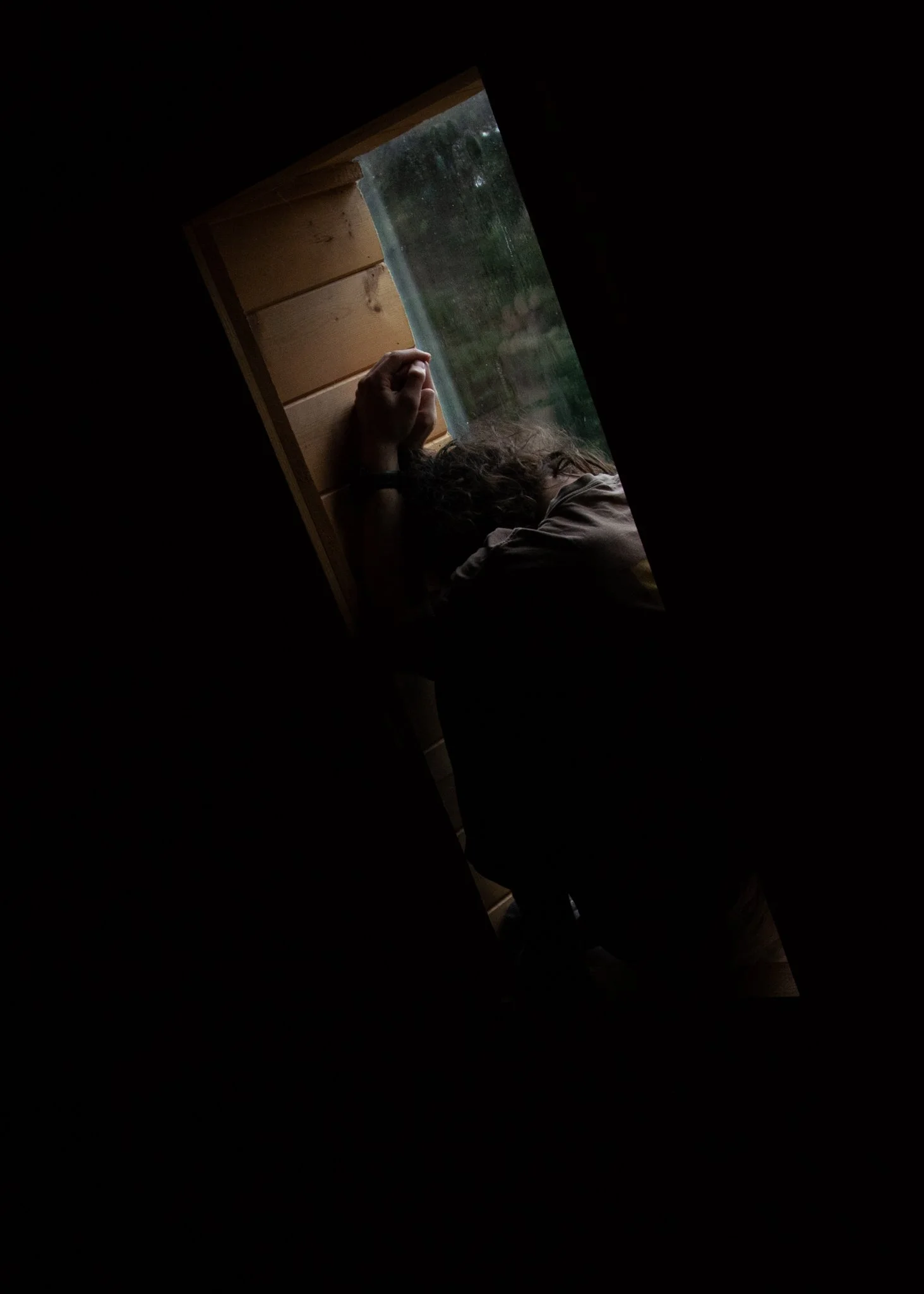 However, I also wanted to reveal the smooth texture of skin and the way the body folds and shapes itself within the window sill. For several frames, I introduced a small amount of ambient light from inside the cabin to bring out forms that would have otherwise remained hidden in shadow. This light also illuminated the surrounding wood, adding texture to the space and gently shifting some focus away from the subject and onto the grain of the environment. Before my subject arrived, I took a few photographs of myself to better understand the composition and available light. One of these resulted in a self-portrait that pairs closely with a similar image of her.